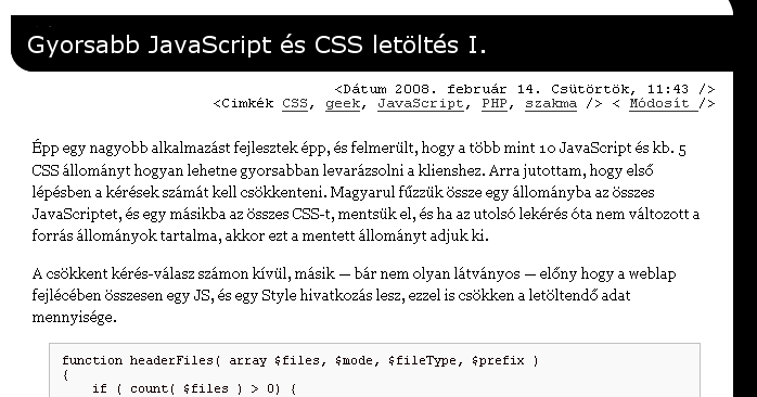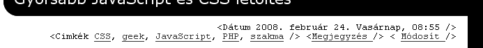 A bejegyzés adatait tartalmazó rész kialakításakor megengedtem egy pici játékot (amennyit a szerkezet engedett). A :before, :after kiválasztók és a content szabály használatával az adat blokkok felidézik a HTML kódok szerkezetét. Gondolkodtam rajta, hogyan lehetne atribútum/értéké párokat is megjeleníteni, de úgy tűnt számomra, hogy ezt csak a szerkezet jelentős módosítása, és/vagy a szemantikusság feladása árán lehetett volna elérni.