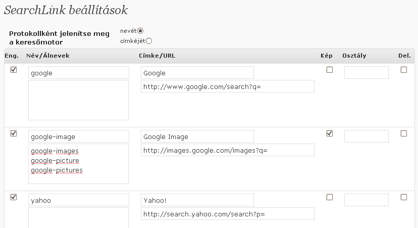 Egyenként engedélyezhető mind, további álneveket adhatsz a keresőkhöz, és a törlésre is megvan a lehetőség.